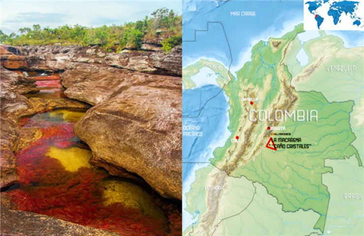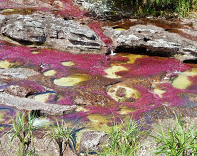 Surnommée parfois «rivière aux cinq couleurs», Caño Cristales doit sa teinte à la Macarenia clavigera, une plante aquatique (algue endémique) qui colore les fonds rocheux entre juin et novembre.