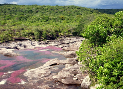 Caño Cristales est un site naturel situé dans le parc national La Macarena, dans le département du Méta, au centre de la Colombie. à la frontière entre la Cordillère des Andes, les plaines de llanos et la forêt amazonienne, le parc national possède l'une des plus riches biodiversités au monde. La Macarena s'étend sur près de 630 000 hectares et se compose de forêts tropicales, de cours d'eau et de formations rocheuses. Dans cet environnement naturel vivent des centaines d'oiseaux et d'animaux sauvages. La Serranía de la Macarena compte parmi les plus parcs nationaux les plus riches au monde en termes de biodiversité. Elle fait partie du fameux bouclier guyanais considéré comme la plus ancienne formation géologique de la planète (2milliards d'années)