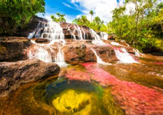 Caño Cristales est un site naturel situé dans le parc national La Macarena, dans le département du Méta, au centre de la Colombie. à la frontière entre la Cordillère des Andes, les plaines de llanos et la forêt amazonienne, le parc national possède l'une des plus riches biodiversités au monde. La Macarena s'étend sur près de 630 000 hectares et se compose de forêts tropicales, de cours d'eau et de formations rocheuses. Dans cet environnement naturel vivent des centaines d'oiseaux et d'animaux sauvages. La Serranía de la Macarena compte parmi les plus parcs nationaux les plus riches au monde en termes de biodiversité. Elle fait partie du fameux bouclier guyanais considéré comme la plus ancienne formation géologique de la planète (2milliards d'années)